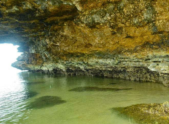 At the right end of the cove, you can see the cave called Kwebang Lampas. The cave is like a rocky tunnel, just be very careful exploring the inside of the cave because the rocks can be really slippery and you wouldn't want to risk hitting your head at any of the hard rock everywhere. You can exit at the other end though you may need to swim in a few meters deep water to get back to the shore.